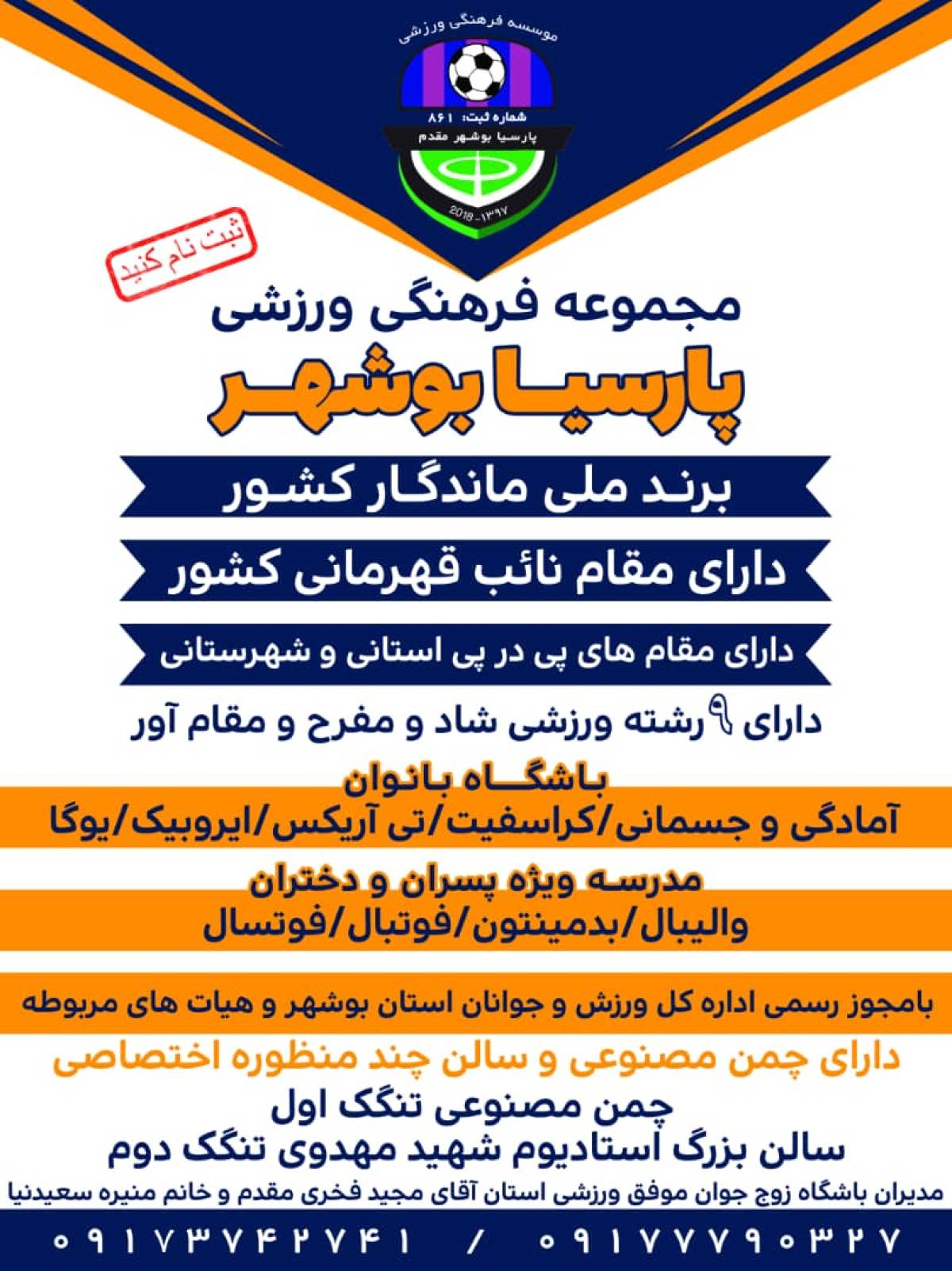 مجموعه فرهنگی‌ورزشی پارسیا بوشهر با مجوز رسمی از اداره کل ورزش و جوانان استان بوشهر، از علاقمندان به ورزش در رشته‌های مختلف ثبت‌نام می‌کند.