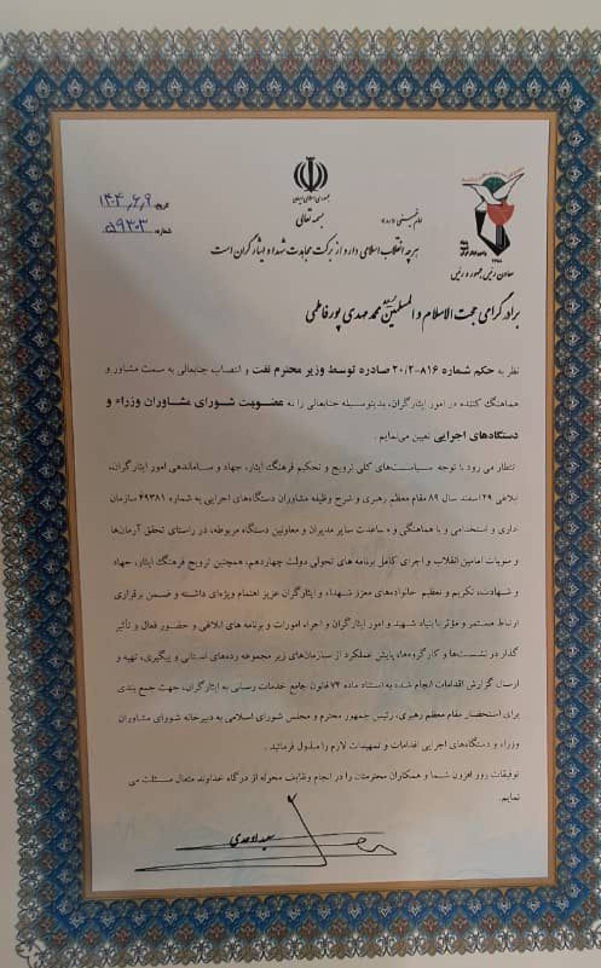 با حکم سعید اوحدی، معاون رئیسجمهور و رئیس بنیاد شهید و امور ایثارگران، حجتالاسلام و المسلمین سید محمدمهدی پورفاطمی به عنوان عضو شورای مشاوران وزرا و دستگاههای اجرایی منصوب شد.