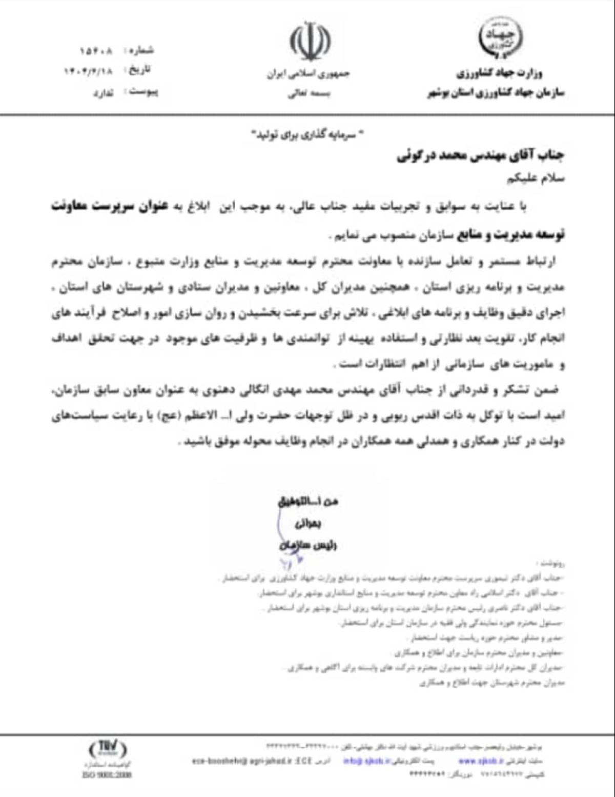 انتصاب سرپرست جدید معاونت توسعه مدیریت و منابع جهاد کشاورزی استان بوشهر