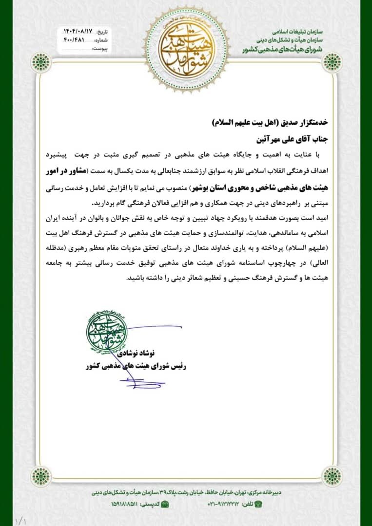 طی حکمی از سوی نوشاد نوشادی رئیس شورای هیأتهای مذهبی کشور، جناب آقای علی مهرآئین بهعنوان مشاور در امور هیأتهای مذهبی شاخص و محوری استان بوشهر منصوب شد.
