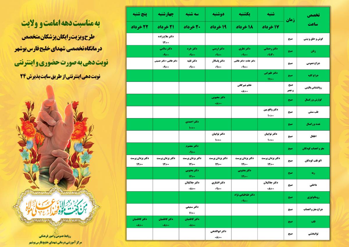 ویزیت رایگان پزشکان متخصص در مرکز شهدای خلیج فارس بوشهر همزمان با دهه ولایت