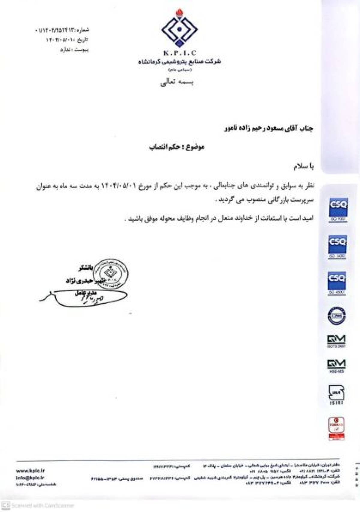 ۲. همانطور که در حکم رسمی انتصاب شماره ۱۴۰/۴۵۲۳/۱۳۰ مورخ ۱۴۰۴/۰۵/۰۱ آمده است، جناب آقای مسعود رحیمزاده نامور به مدت سه ماه به عنوان «سرپرست بازرگانی» منصوب شدهاند. این سند رسمی، هرگونه شایعهپراکنی در این خصوص را تکذیب میکند.