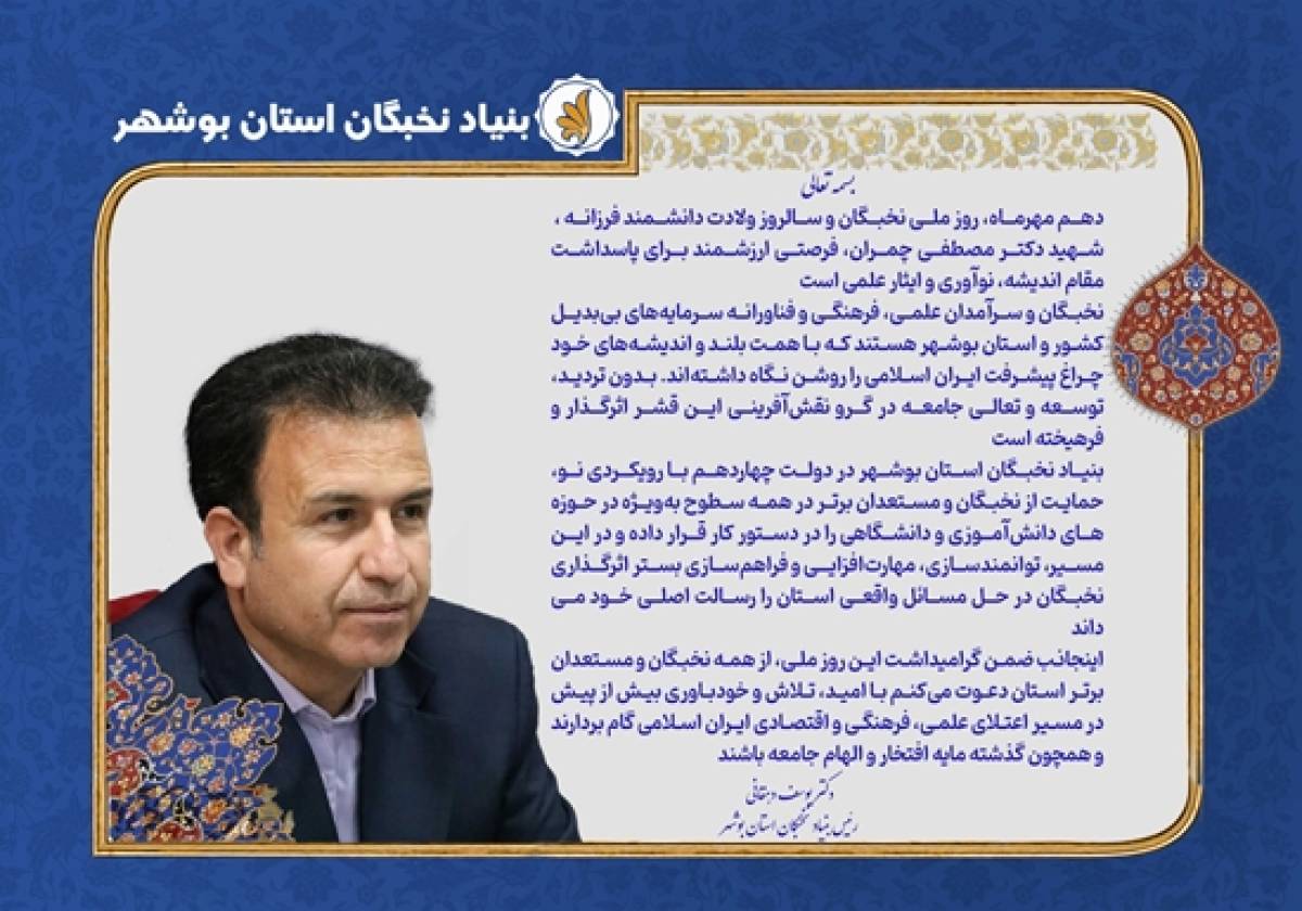۱۰ مهرماه، روز ملی نخبگان و سالروز ولادت دانشمند فرزانه و مجاهد راه حق، شهید دکتر مصطفی چمران، فرصتی ارزشمند برای پاسداشت مقام اندیشه، نوآوری و ایثار علمی است.نخبگان و سرآمدان علمی، فرهنگی و فناورانه سرمایه‌های بی‌بدیل کشور و استان بوشهر هستند که با همت بلند و اندیشه‌های خلاقانه خود چراغ پیشرفت ایران اسلامی را روشن نگاه داشته‌اند. بدون تردید، توسعه و تعالی جامعه در گرو نقش‌آفرینی این قشر اثرگذار و فرهیخته است.بنیاد نخبگان استان بوشهر در دولت چهاردهم با رویکردی نو، حمایت از نخبگان و مستعدان برتر در همه سطوح به‌ویژه در حوزه‌های دانش‌آموزی و دانشگاهی را در دستور کار قرار داده و در این مسیر، توانمندسازی، مهارت‌افزایی و فراهم‌سازی بستر اثرگذاری نخبگان در حل مسائل واقعی استان را رسالت اصلی خود می‌داند.اینجانب ضمن گرامیداشت این روز ملی، از همه نخبگان و مستعدان برتر استان دعوت می‌کنم با امید، تلاش و خودباوری بیش از پیش در مسیر اعتلای علمی، فرهنگی و اقتصادی ایران اسلامی گام بردارند و همچون گذشته مایه افتخار و الهام جامعه باشند.