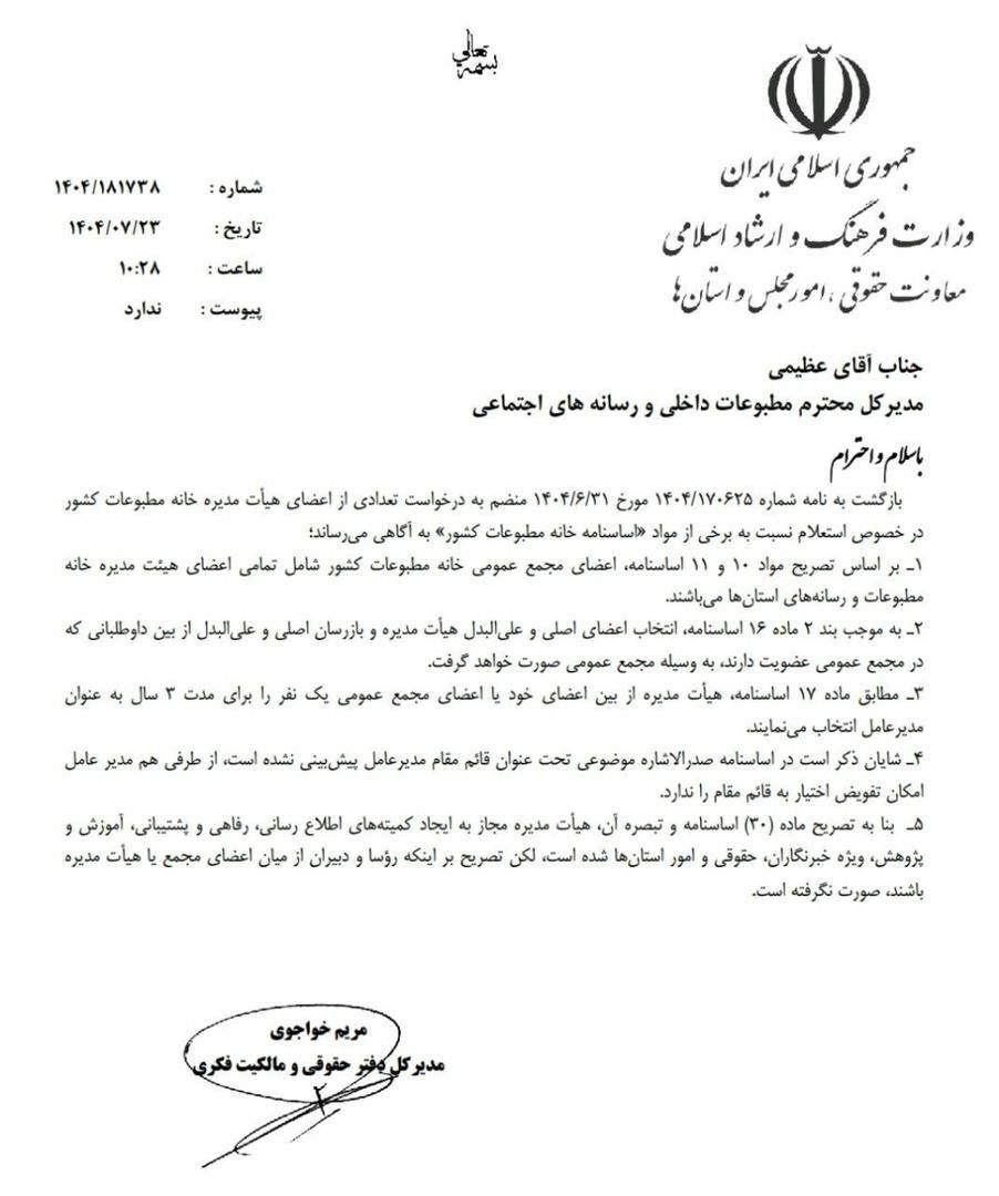 در حالی که وزارت فرهنگ و ارشاد اسلامی طی نامه رسمی خود بر قانونی بودن ترکیب جدید اعضای هیأتمدیره و مدیرعامل منتخب تأکید کرده است، ادامه این مقاومتها نه تنها فاقد وجاهت اداری است بلکه مصداق تخلف از مصوبات وزارتخانه و اساسنامه خانه مطبوعات کشور و سنگ اندازی در مسیر بهبود مشکلات اصحاب رسانه محسوب میشود.