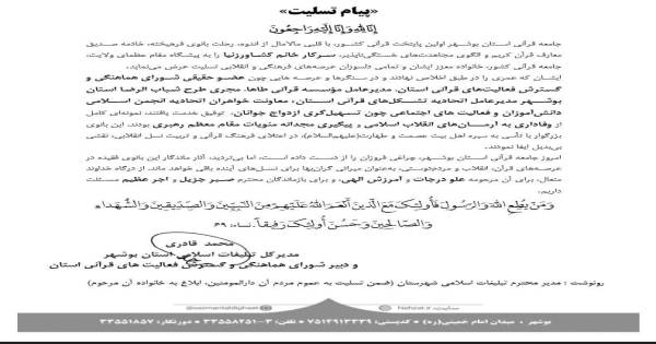 پیام تسلیت مدیرکل تبلیغات اسلامی بوشهر برای درگذشت زهرا کشاورزنیا