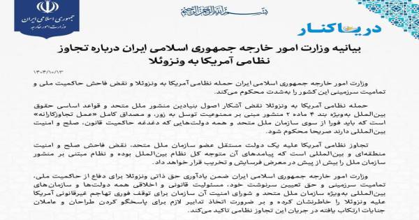 بیانیه وزارت امور خارجه جمهوری اسلامی ایران درباره تجاوز نظامی آمریکا به ونزوئلا