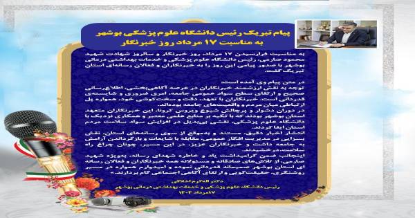 به مناسبت فرارسیدن ۱۷ مرداد، روز خبرنگار و سالروز شهادت شهید محمود صارمی، رئیس دانشگاه علوم پزشکی و خدمات بهداشتی درمانی بوشهر با صدور پیامی این روز را به خبرنگاران و فعالان رسانهای استان تبریک گفت.