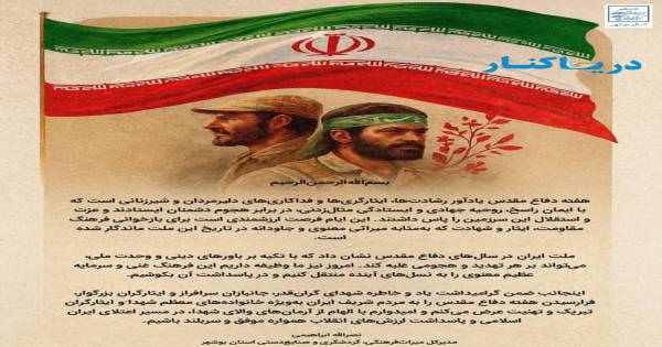 مدیرکل میراث فرهنگی، گردشگری و صنایع دستی استان بوشهر، نصرالله ابراهیمی، فرا رسیدن هفته دفاع مقدس را به مردم ایران به ویژه خانوادههای شهدا و ایثارگران تبریک گفت و ضمن گرامیداشت یاد و خاطره شهدا و جانبازان، بر لزوم انتقال فرهنگ مقاومت و ایثار به نسلهای آینده تأکید کرد. ایشان این ایام را فرصتی ارزشمند برای بازخوانی میراث معنوی دفاع مقدس دانست.