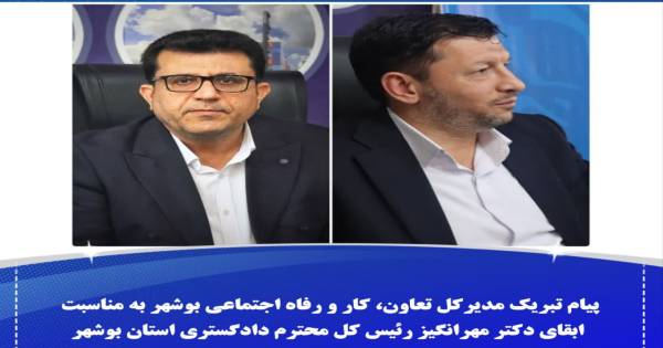 مدیرکل تعاون، کار و رفاه اجتماعی بوشهر به مناسبت ابقای دکتر مهرانگیز رئیس کل محترم دادگستری استان بوشهر پیام تبریکی صادر کرد