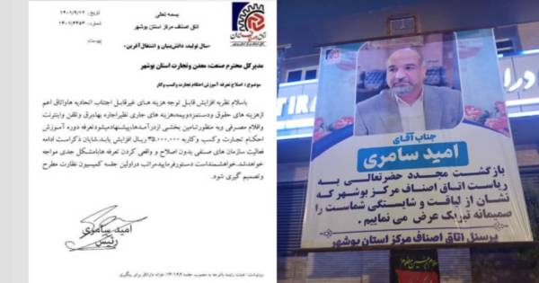 این روزها در شهر بوشهر بنرهای تبریک بازگشت فردی به اتاق اصناف توجه شهروندان را جلب کرده است، این بنرها که با هزینه اتاق اصناف تهیه شدهاند، بازگشت فردی را به این نهاد تبریک میگویند که چند سال پیش با ارسال نامهای به مدیرکل صنعت، معدن و تجارت (صمت) خواستار افزایش چشمگیر هزینه آموزش کسبه شده بود، این هزینه که در سراسر کشور حدود ۳۰۰ هزار تومان است، در پیشنهاد وی به سه میلیون و پانصد هزار تومان افزایش یافته بود، حال مشخص شده منظور وی از این درخواست، هزینهکردهای شخصی و تهیه بنرهای تبریک بوده است.