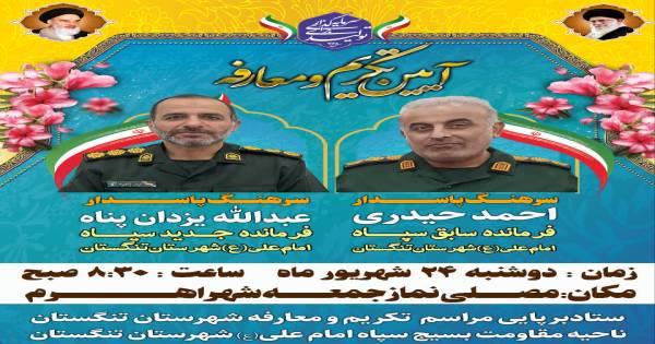 فرماندار تنگستان: مردم قدردان مسئولان صادق و خالصانه‌ خدمتگزار هستند مسلم سلیمانی فرماندار تنگستان در آیین تکریم و معارفه فرمانده سپاه شهرستان با قدردانی از خدمات سرهنگ احمد حیدری و برای سرهنگ عبدالله یزدان‌پناه فرمانده جدید نیز آرزوی توفیق کرد و گفت: مردم تنگستان همواره نشان داده‌اند که قدردان خدمت صادقانه مسئولان هستند و با همراهی خود مسیر مردمداری سپاه در شهرستان ادامه خواهد یافت.
